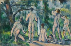В середине 1890-х годов Сезанн задумал создать монументальное полотно с обнаженными в пейзаже – некий синтезированнный образ вселенной. В серии этюдов, к которым относится и московская работа, художник пытался достичь гармонии в изображении обнаженных фигур и пейзажа: тела, деревья, очертания гор вдали составляют единый прочный каркас – опору мироздания. Торсы купальщиков вытянуты и очерчены гибкими прерывистыми линиями, позволяющими фигурам раствориться в окружающем пейзаже. Вместе с тем в этом полотне уже намечены «архитектурные» структурирующие функции природных мотивов, окончательно нашедшие воплощение в знаменитых «Больших купальщиках» (1905–1906) из коллекции Барнса в Мерионе (США).