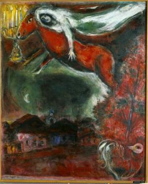 Творчество Шагала не принадлежит к какому-либо направлению. Он создал свой собственный неповторимый стиль в искусстве. Постоянные мотивы в картинах художника, навеянные впечатлениями детства и юности, проведенных в Витебске, — парящие в воздухе влюбленные, скрипач, лошадь, корова, петух, в различных вариациях сопровождали произведения художника на протяжении всей его жизни. Картина «Ночная сцена» входит в цикл произведений Шагала, написанных после неожиданной кончины его жены Беллы, смерть которой он тяжело переживал. Он изобразил Беллу летящей в белом саване на огненном коне, в копытах которого — семисвечник. Конь, символ дикой стихии, несется со своей всадницей по небу над Покровской улицей в Витебске, где художник изобразил дом, в котором он жил с Беллой после свадьбы. Дикий конь уносит Беллу в прошлое, в мир воспоминаний. На саване возлюбленной Шагал изобразил свой профиль, смотрящий в противоположную полету сторону: художник прощается с Беллой. Петух, из которого растет дерево, объятое пламенем, символизирует скорбящую душу художника.