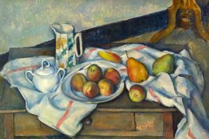 В период зрелого творчества Сезанн сосредоточился на экспериментах с постановкой предметов. Он создает динамичные кадрированные композиции, сопоставляя объемные геометризованные объекты (посуда, фрукты) с цветными плоскостными орнаментами (рисунки на ткани, обоях, посуде). Предметы переходили из одной картины в другую; часть этих вещей сохранилась и экспонируется в мастерской-музее художника в Эксе. Натюрморты Сезанна этого времени сравнимы с его пейзажами: складки белой скатерти на фоне бело-голубой стены топорщатся острыми углами, подобно холмам Экса.