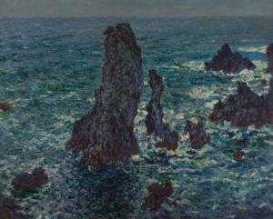 Скалы в Бель-Иль (Пирамиды Порт-Котон, бурное море)